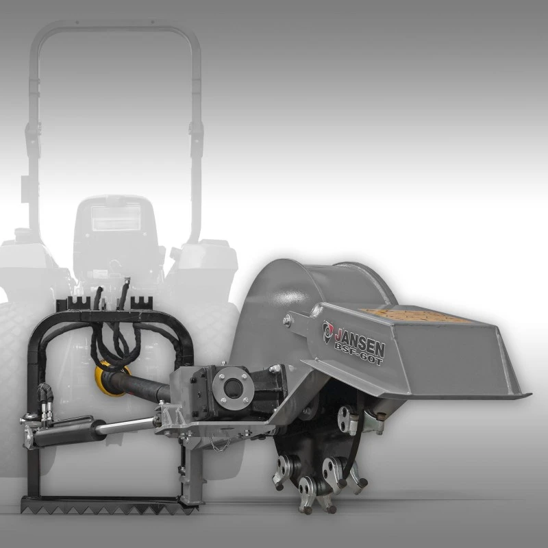 Onze boomstronkfrees BSF-60T is ontworpen voor bevestiging aan uw tractor en wordt door de aftakas (bij levering inbegrepen) aangedreven. Het basisframe bestaat uit de driepuntsbevestiging en de stabiele steunpoten.